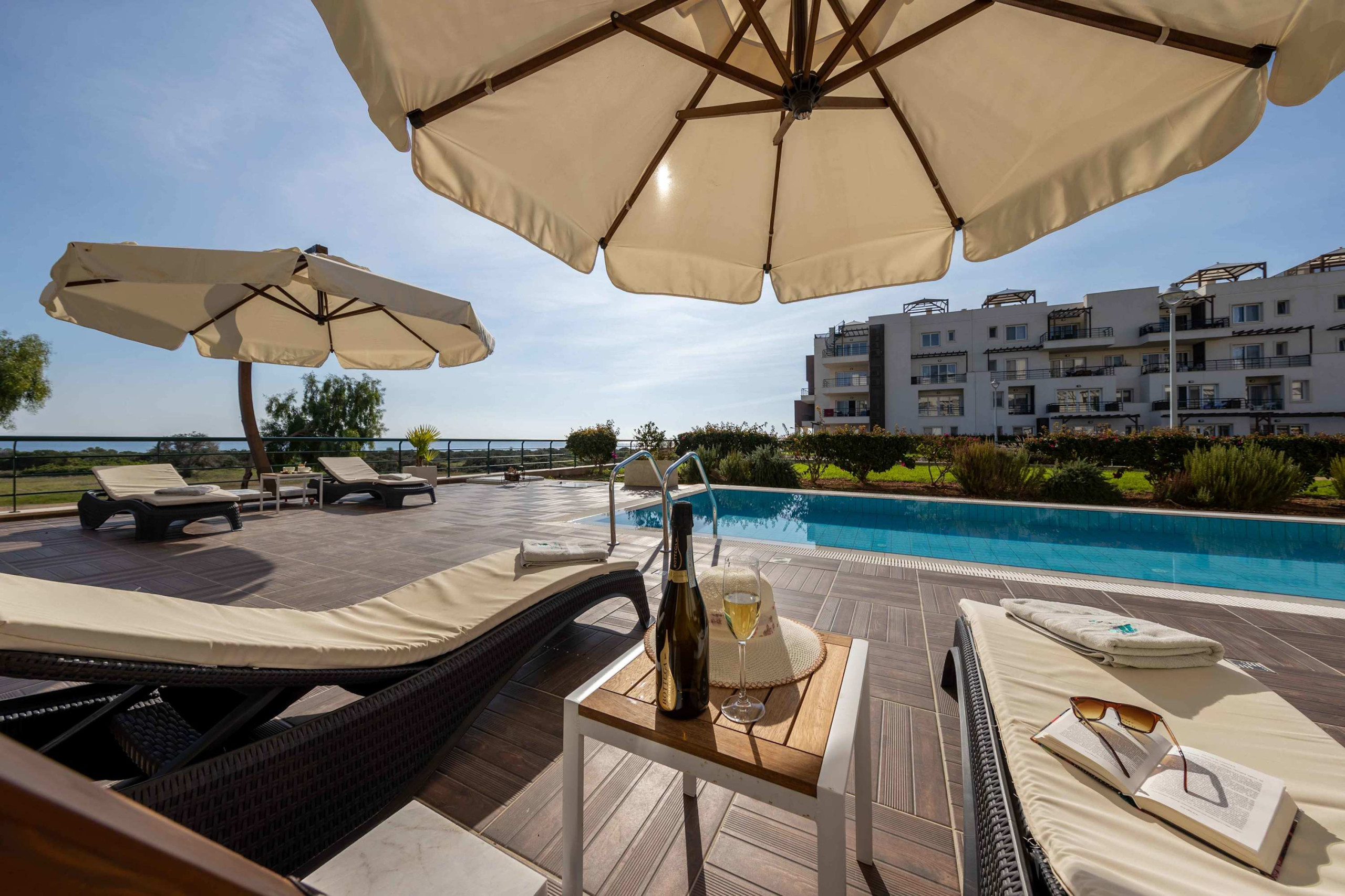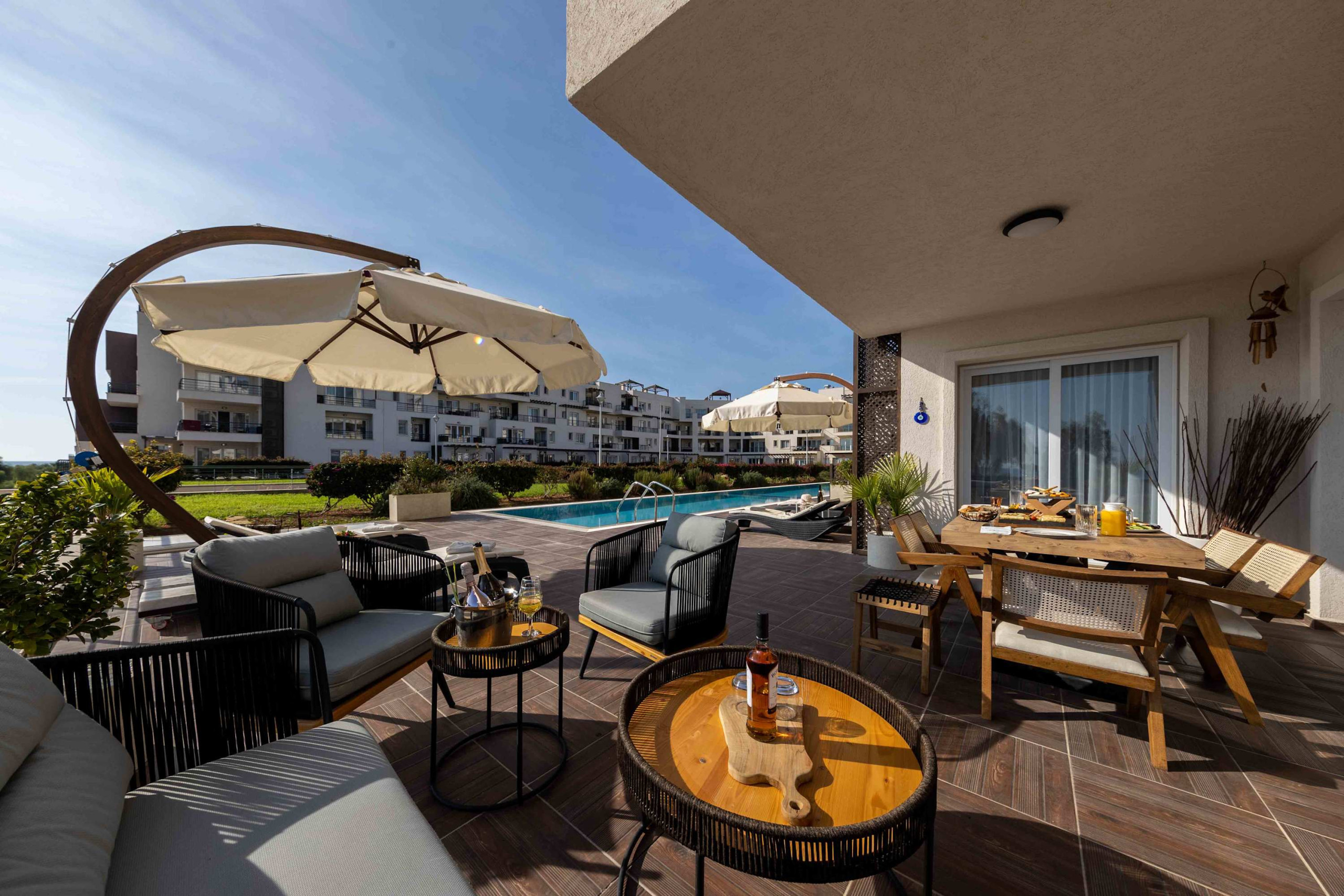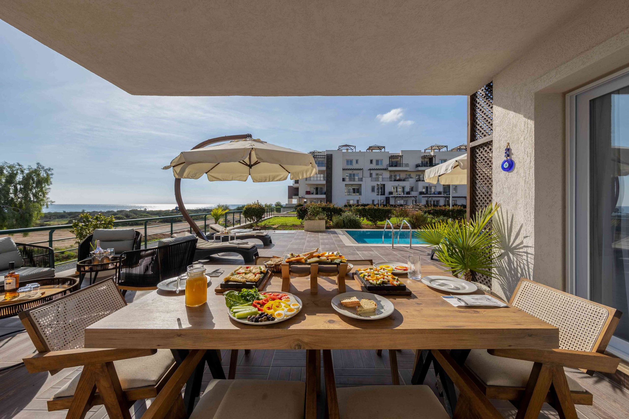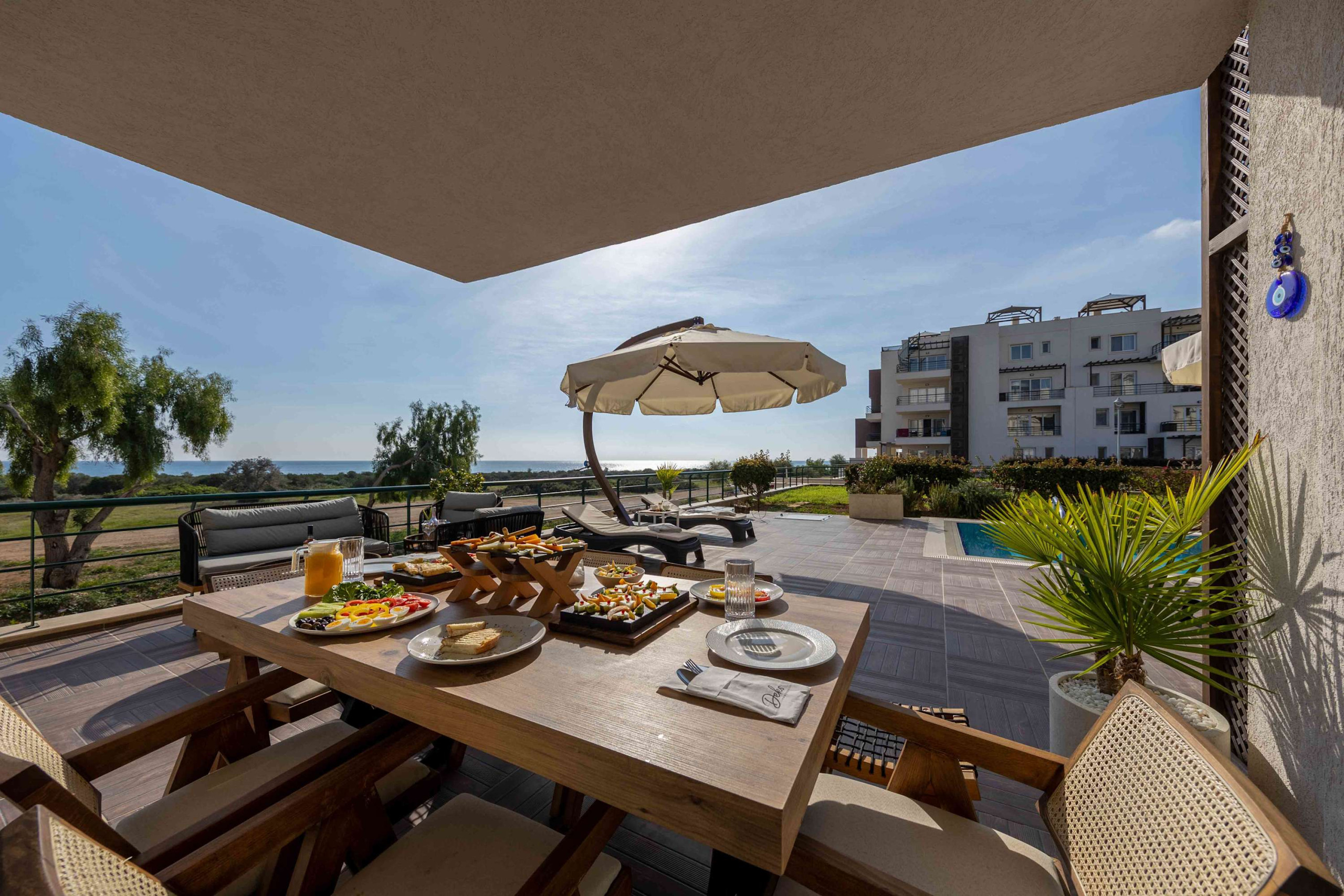 Your living space extends to the 16m2 Terrace with a private pool furnished with garden furniture, where you can relax and watch the beautiful Mediterranean sea view at both sunrise and sunset. The apartment is located at Thalassa Beach Resort & Spa, in Bafra, on the south east coast of North Cyprus. Thalassa is a residential beachfront resort, perfect for couples, solo travellers as well as families. It is a fantastic resort for long holidays, mini-breaks and weekend getaway holidays in North Cyprus.