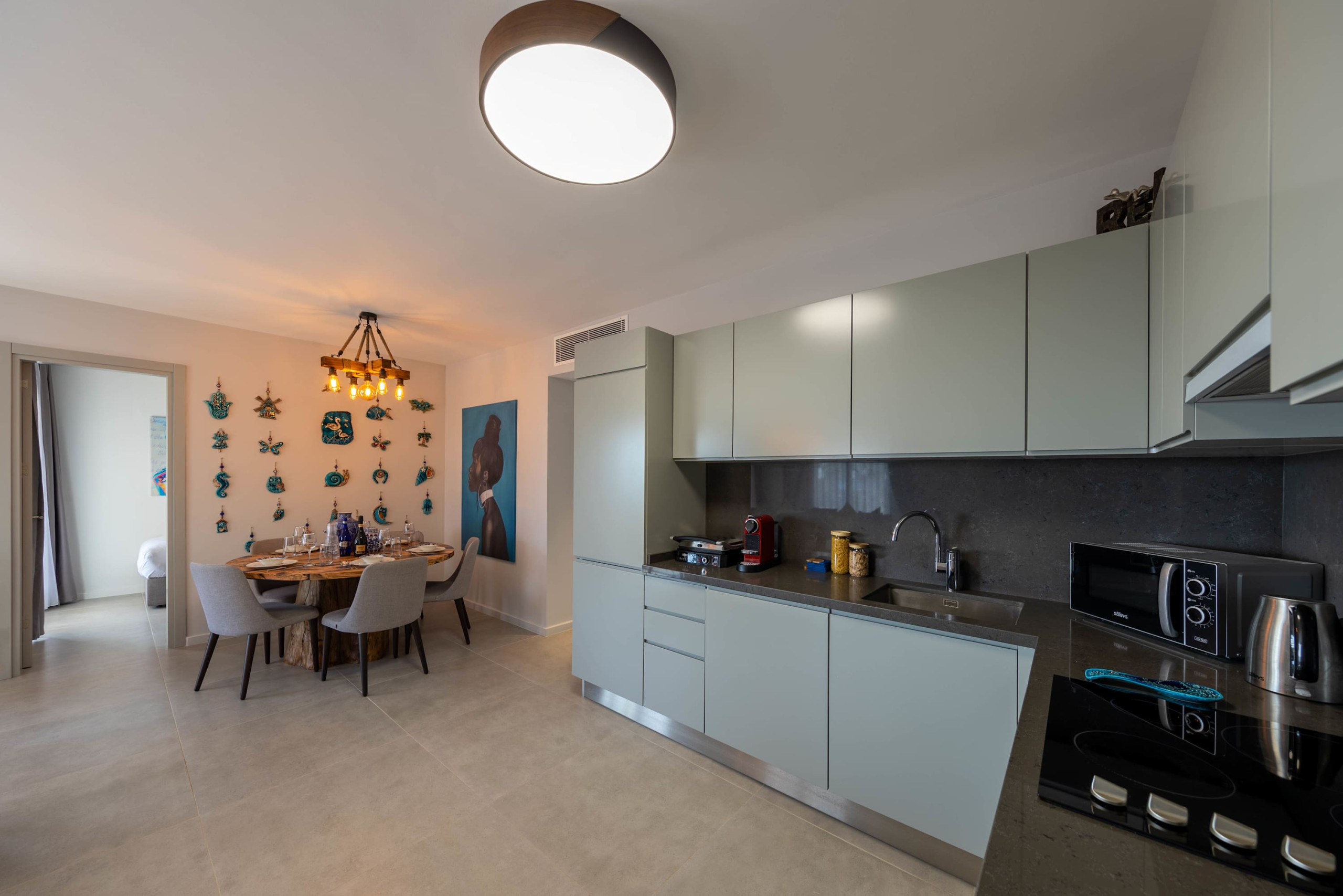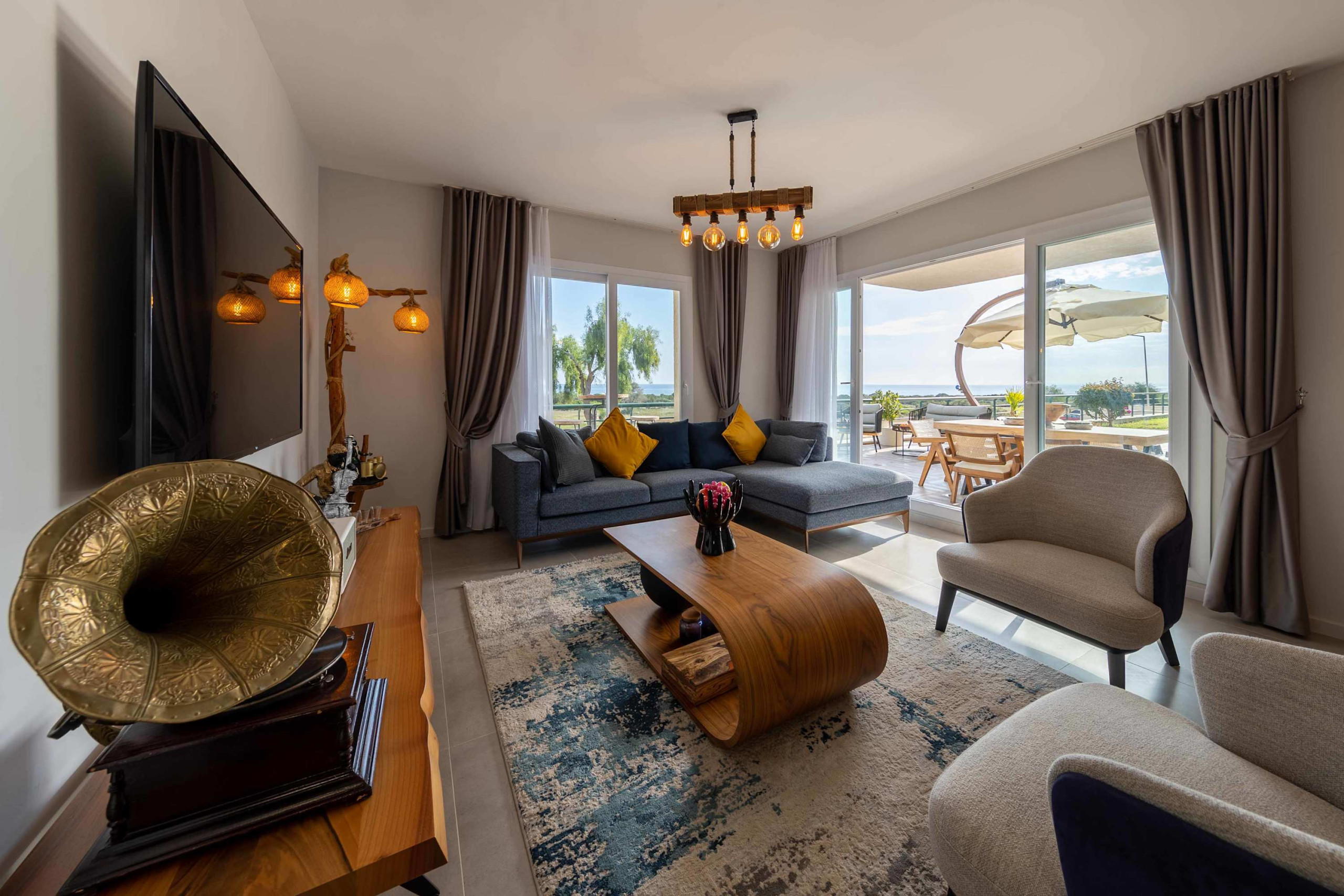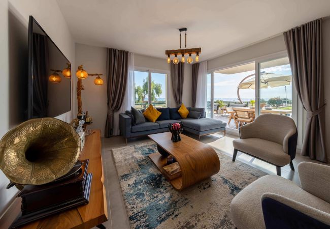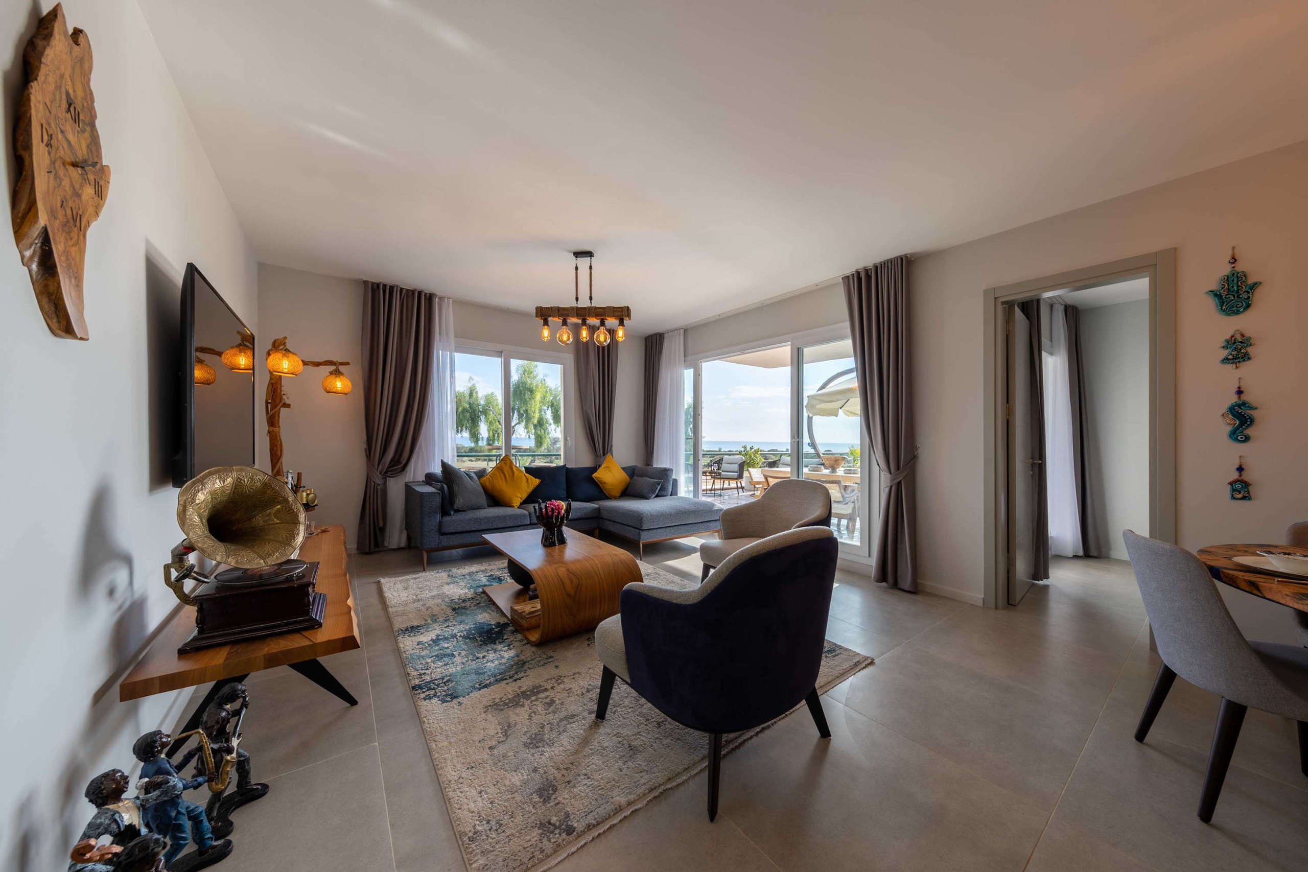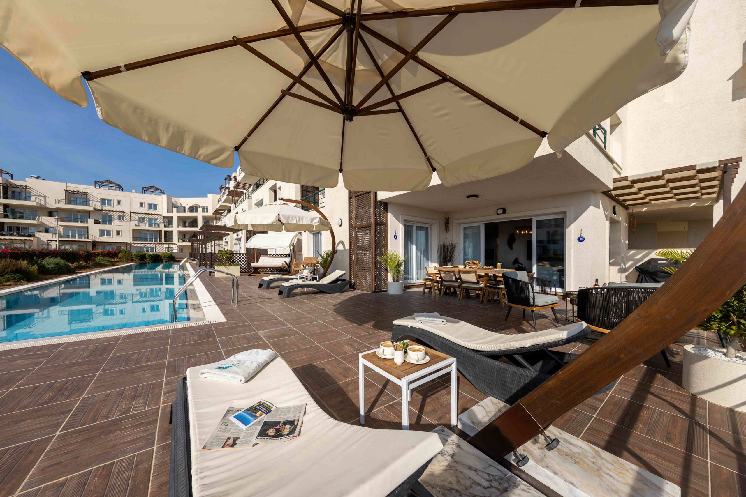 Your living space extends to the 16m2 Terrace with a private pool furnished with garden furniture, where you can relax and watch the beautiful Mediterranean sea view at both sunrise and sunset. The apartment is located at Thalassa Beach Resort & Spa, in Bafra, on the south east coast of North Cyprus. Thalassa is a residential beachfront resort, perfect for couples, solo travellers as well as families. It is a fantastic resort for long holidays, mini-breaks and weekend getaway holidays in North Cyprus.