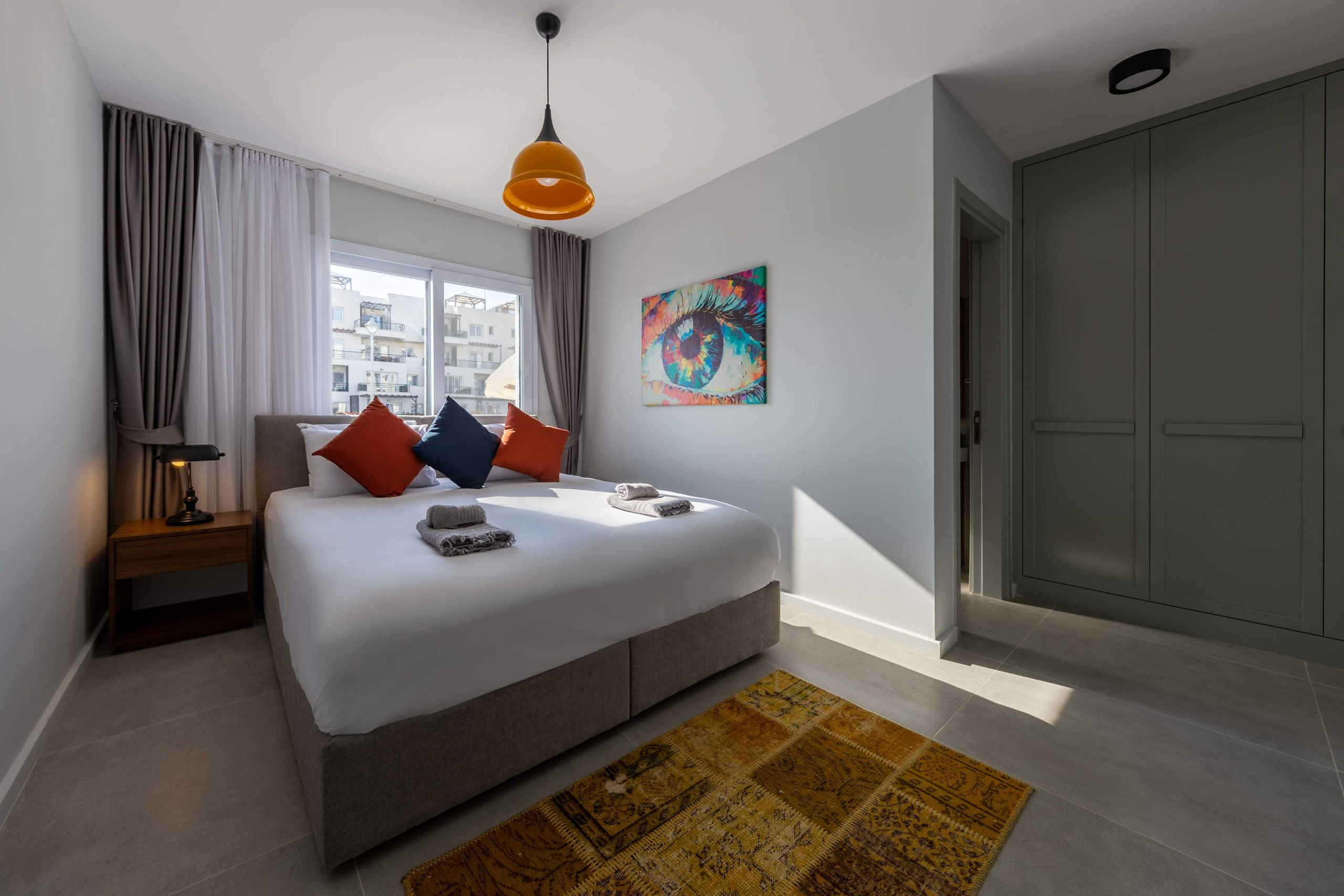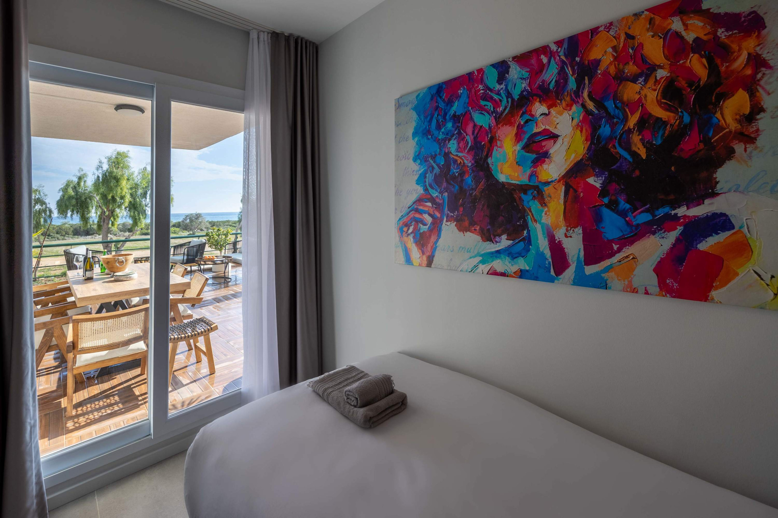 The crown jewel of Thalassa Beach Resort, this Spacious and renovated 90m2 Three Bedroom Apartment featuring an extensive private pool for guests who are looking for this extra, pampering privacy. This tastefully furnished apartment has a large living room and 3 seperate bedrooms. The apartment has a queen size bed in the master bedroom, 2 single beds in the other, 2nd bedroom and a single bed in the 3rd bedroom. The Apartment is equipped with all essentials such as air conditioning, washing machine, iron, TV and more. Fully equipped kitchen supplied with gas/electric hob, oven, refrigerator & freezer, toaster, kettle dishes/cutlery, and kitchen utensils.