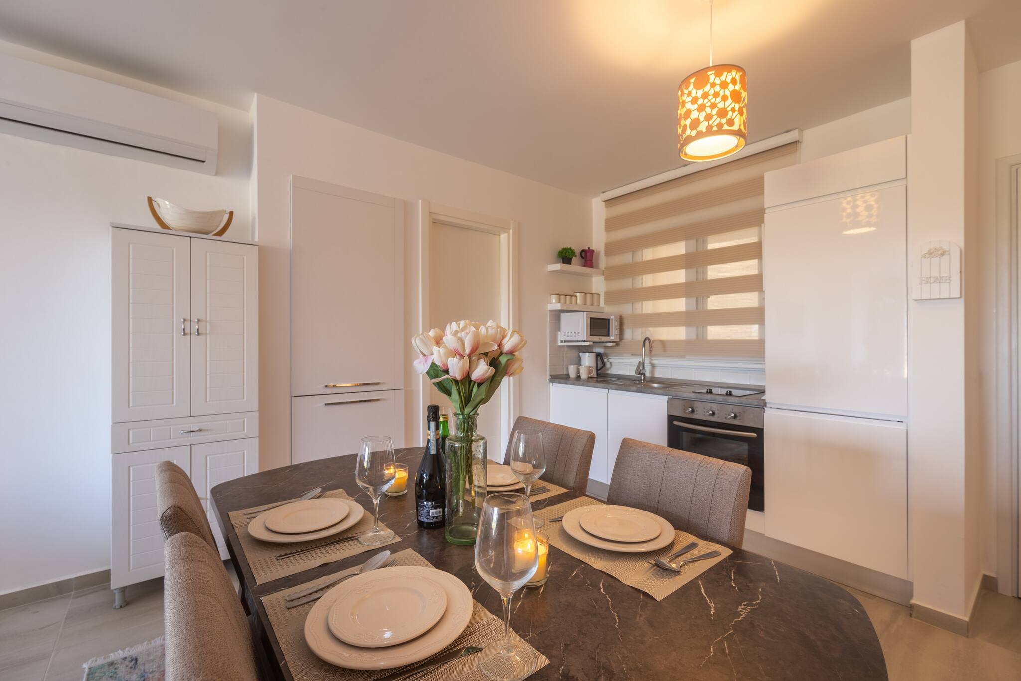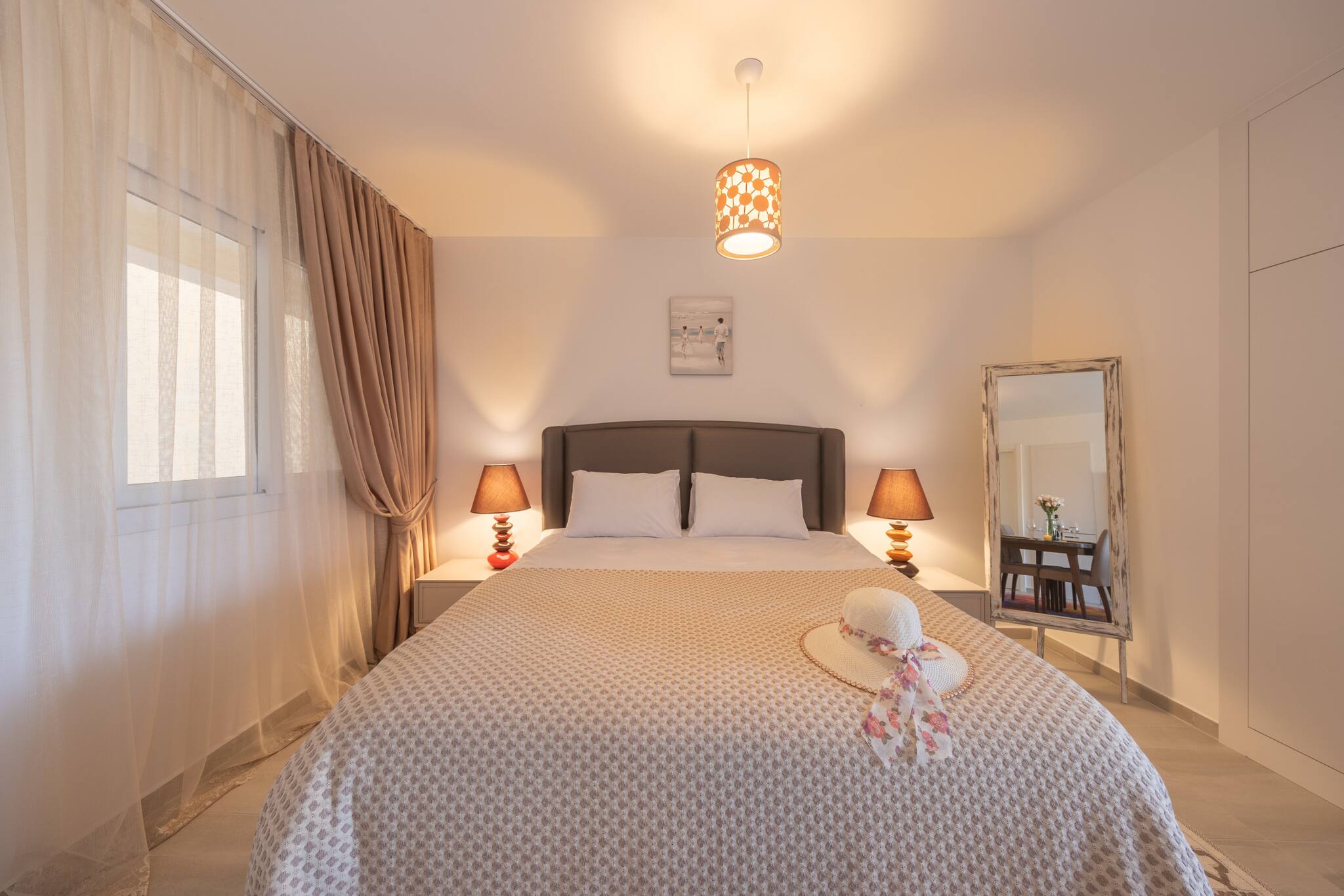 A Spacious 60m2 Two Bedroom apartment with a living room and 2 seperate bedrooms. One bedroom's window is facing the living area while the other bedroom has an external window overlooking outside. The Apartment is tastefully designed in a modern decor and it is fully furnished with all essentials such as air conditioning, washing machine, iron, TV and more. Fully equipped kitchen supplied with gas/electric hob, oven, refrigerator & freezer, toaster, kettle dishes/cutlery, and kitchen utensils.