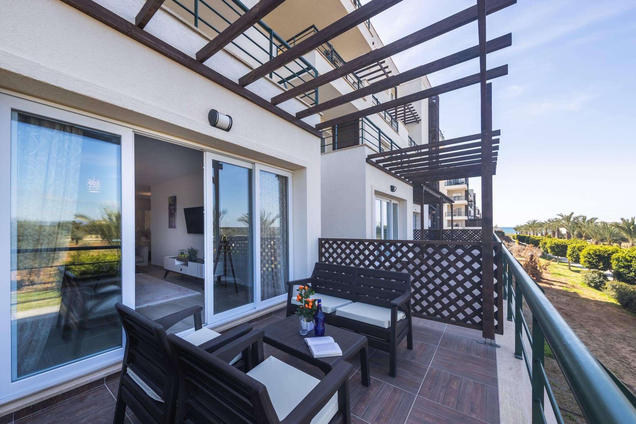 Your living space extends to the 8m2 balcony, furnished with balcony furniture, where you can relax and watch the beautiful Mediterranean sea view at both sunrise and sunset. The apartment is located at Thalassa Beach Resort & Spa, in Bafra, on the south east coast of North Cyprus. Thalassa is a residential beachfront resort, perfect for couples, solo travellers as well as families. It is a fantastic resort for long holidays, mini-breaks and weekend getaway holidays in North Cyprus.