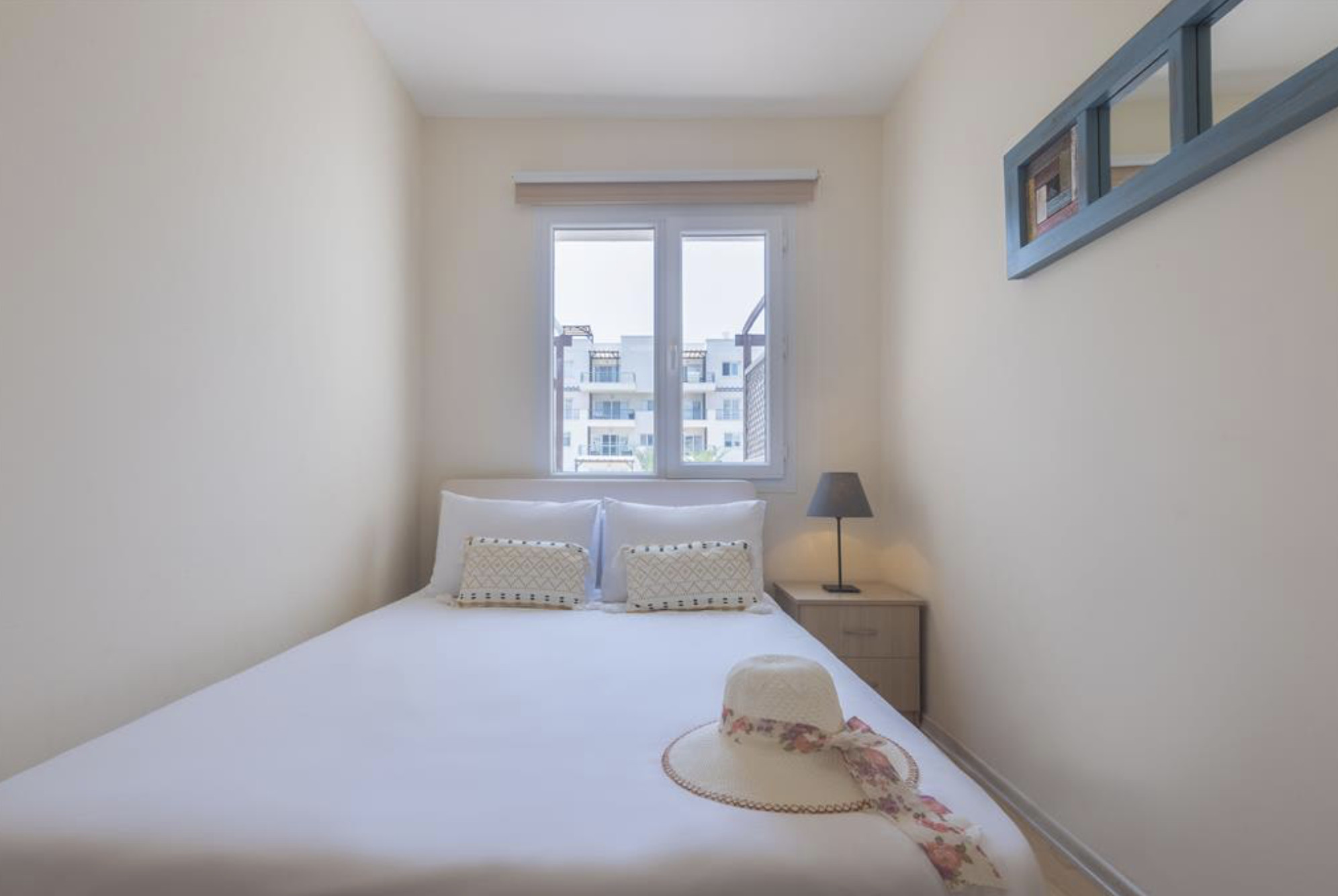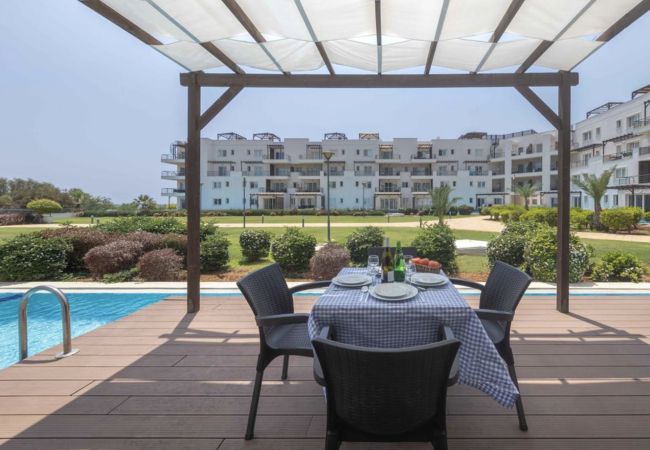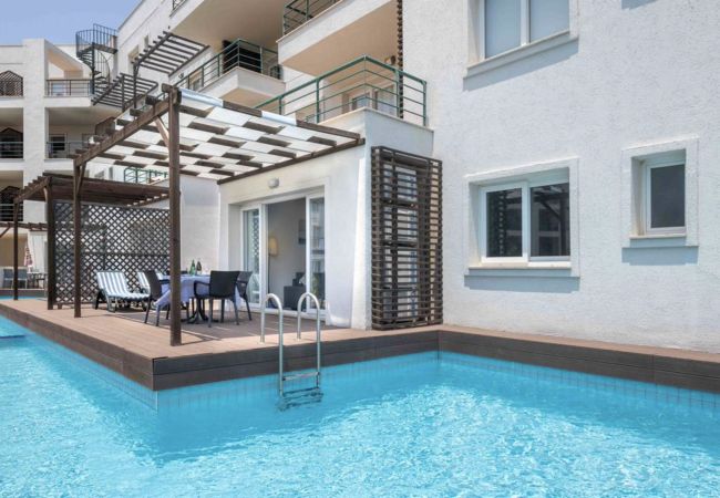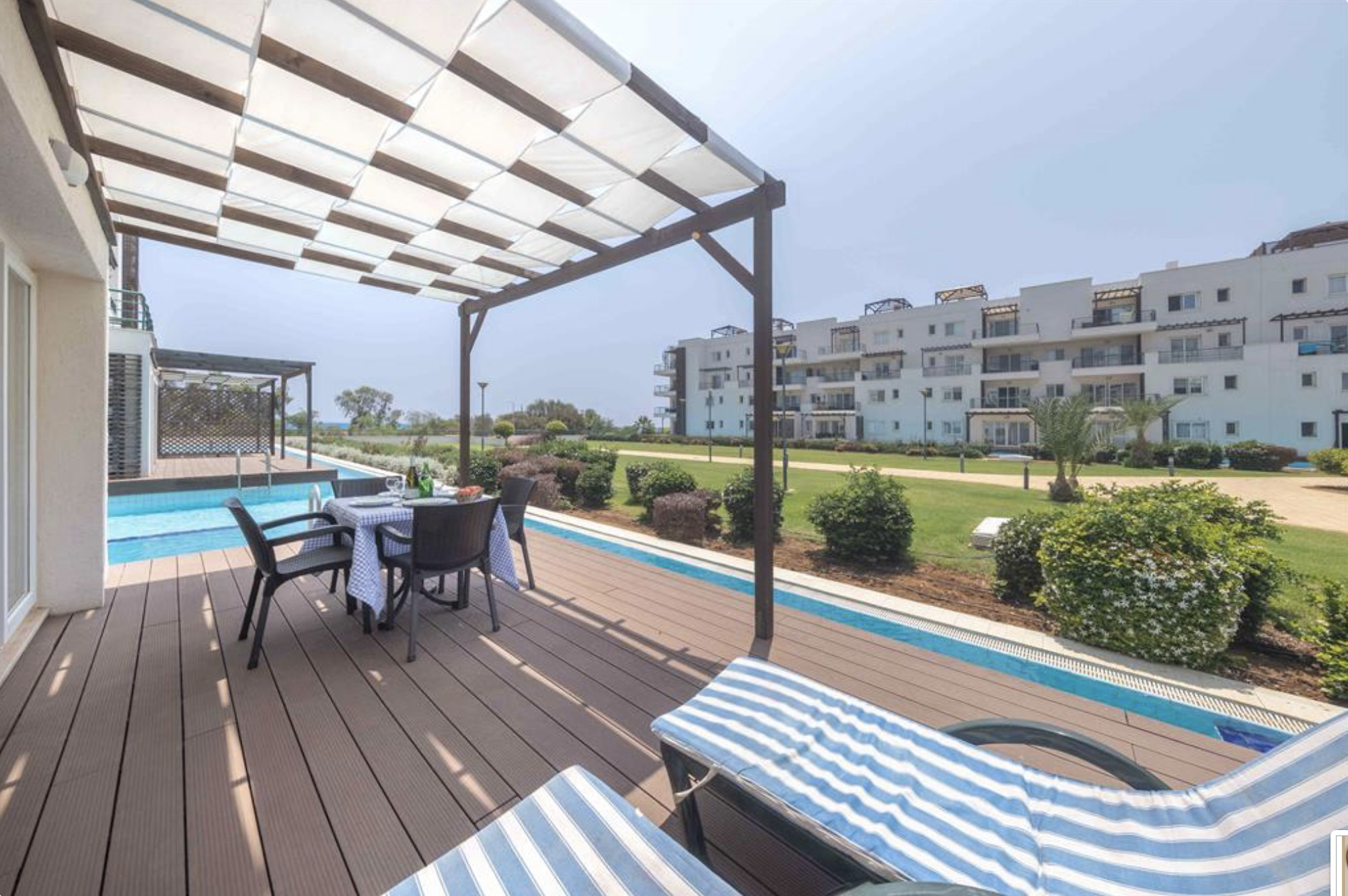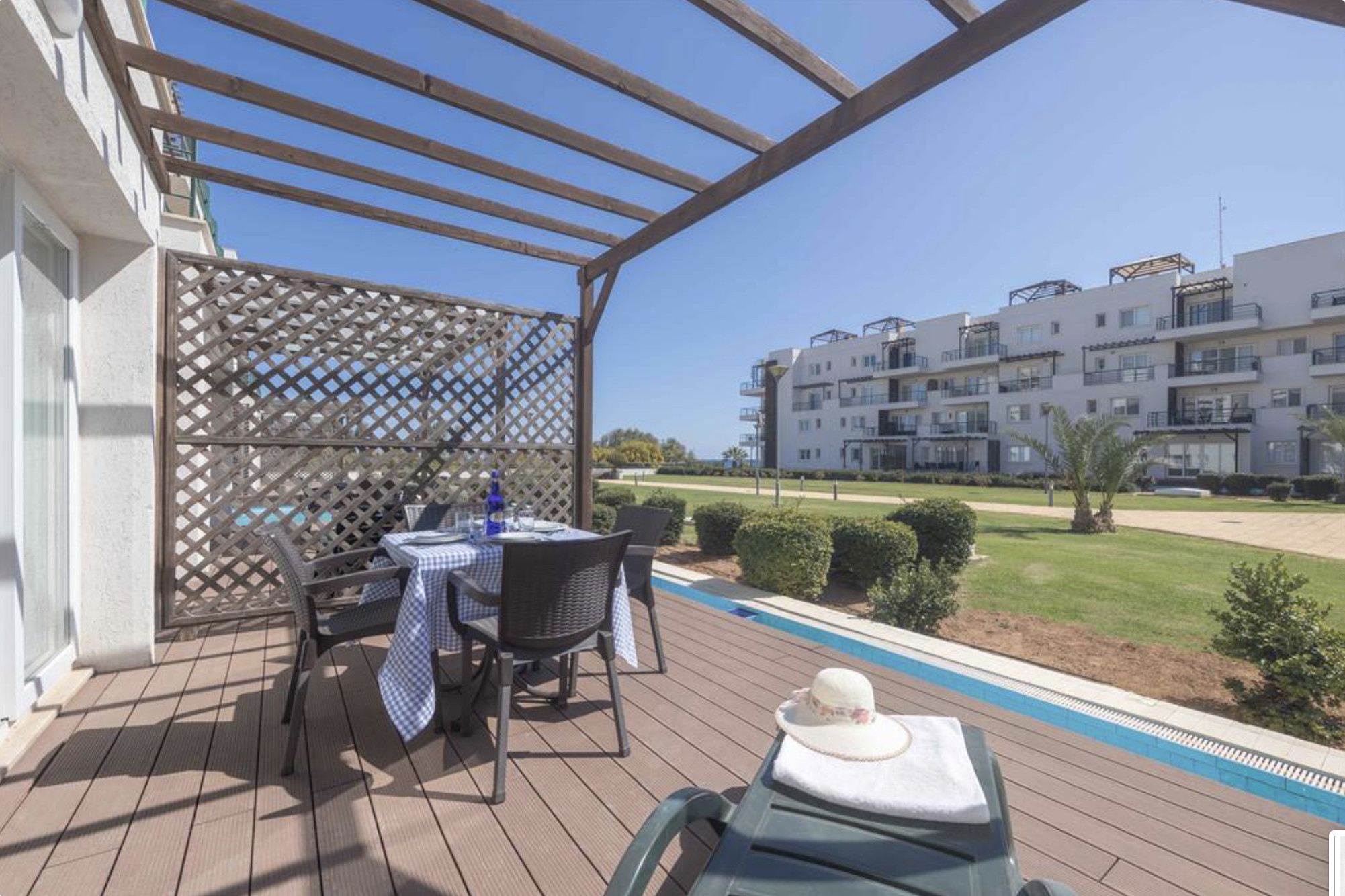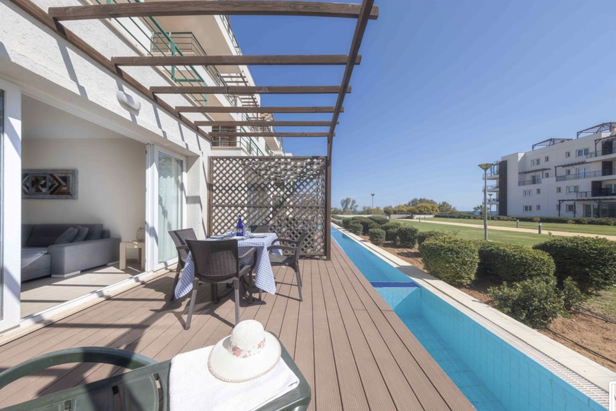 Your living space extends to the 16m2 Terrace with a private pool furnished with garden furniture, where you can relax and watch the beautiful Mediterranean sea view at both sunrise and sunset. The apartment is located at Thalassa Beach Resort & Spa, in Bafra, on the south east coast of North Cyprus. Thalassa is a residential beachfront resort, perfect for couples, solo travellers as well as families. It is a fantastic resort for long holidays, mini-breaks and weekend getaway holidays in North Cyprus.