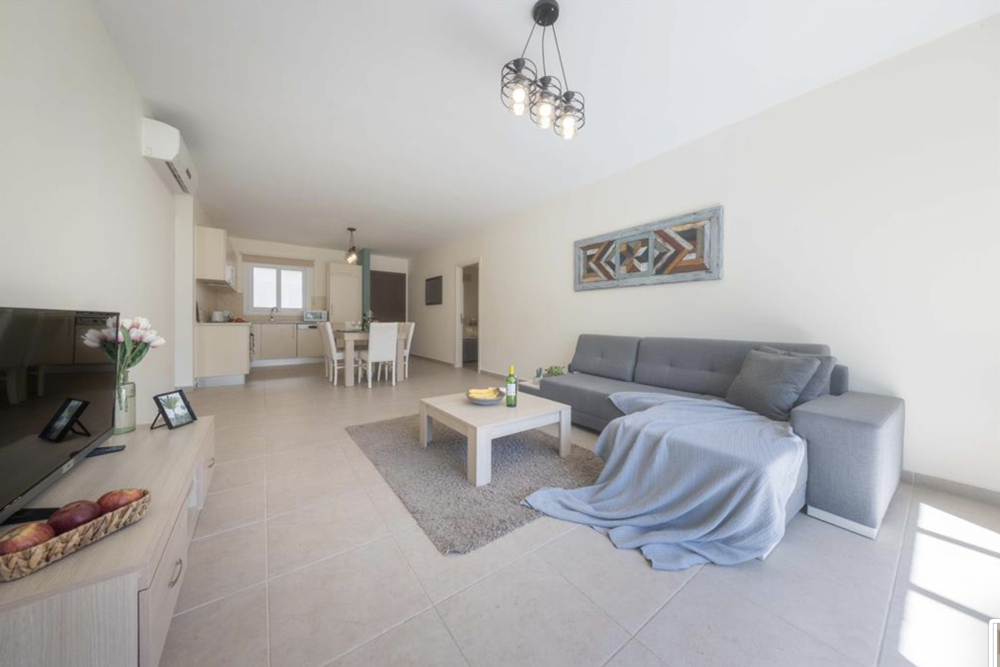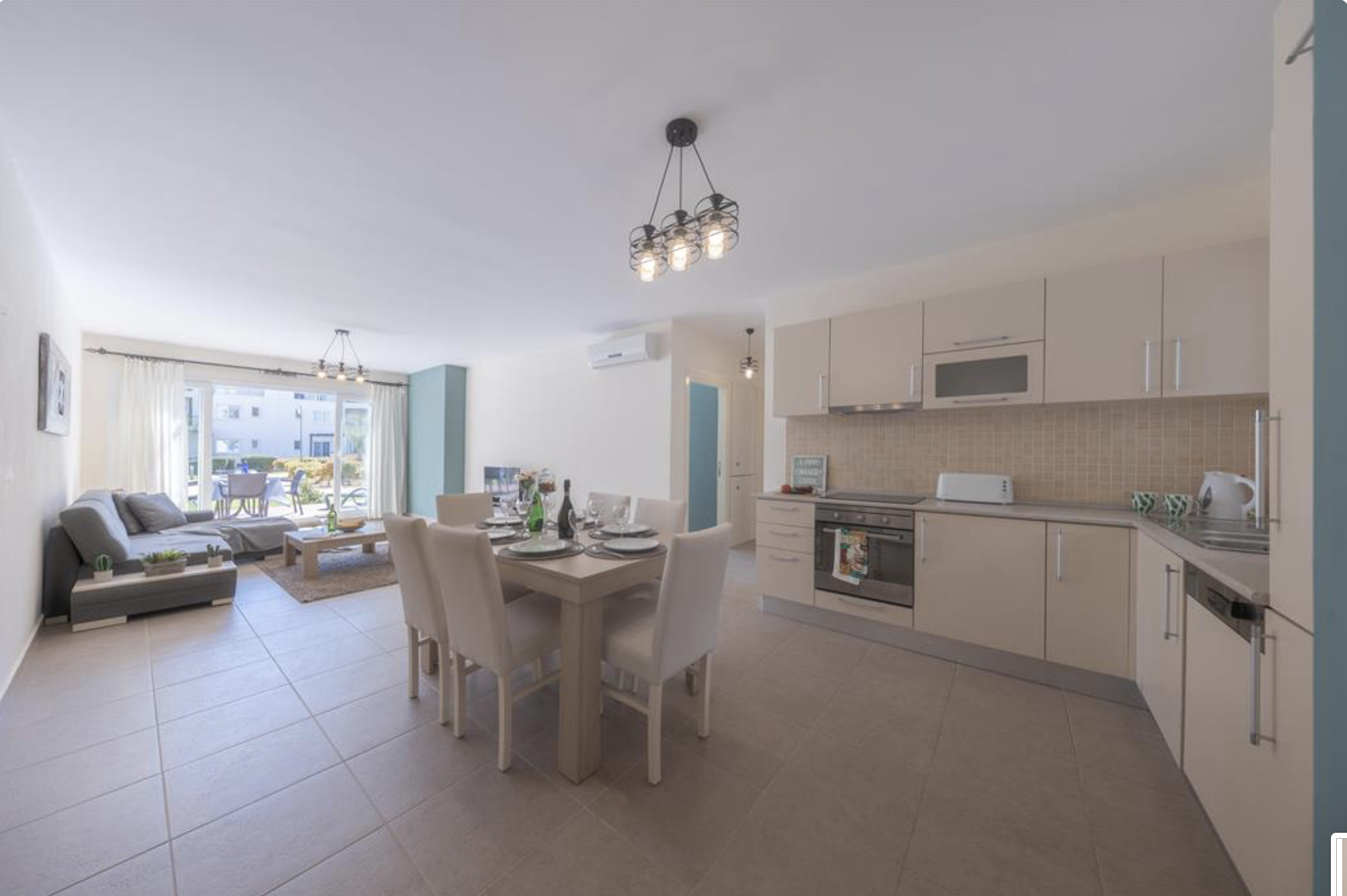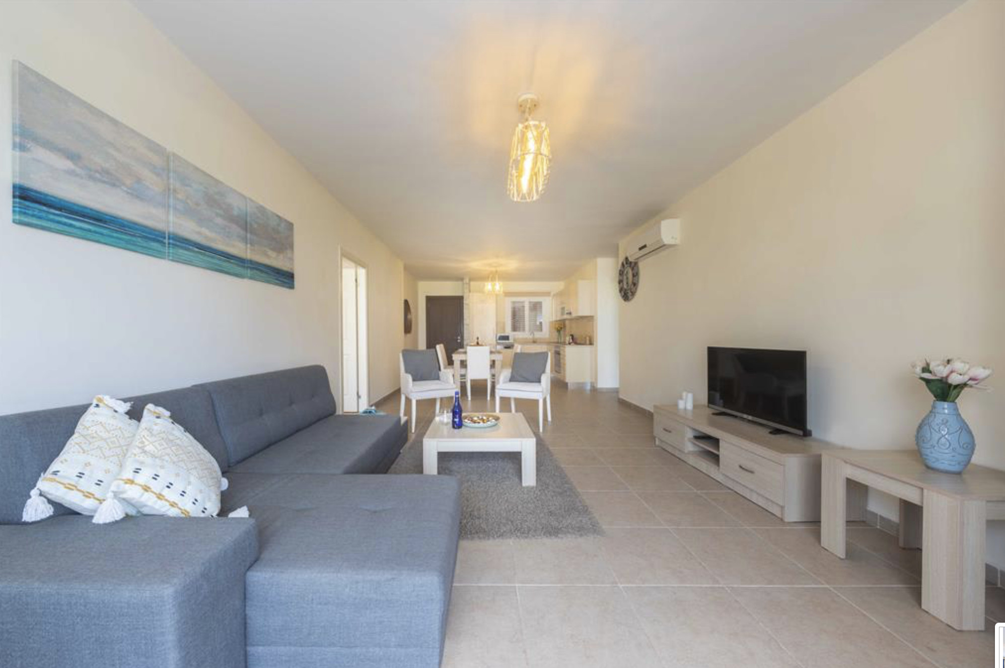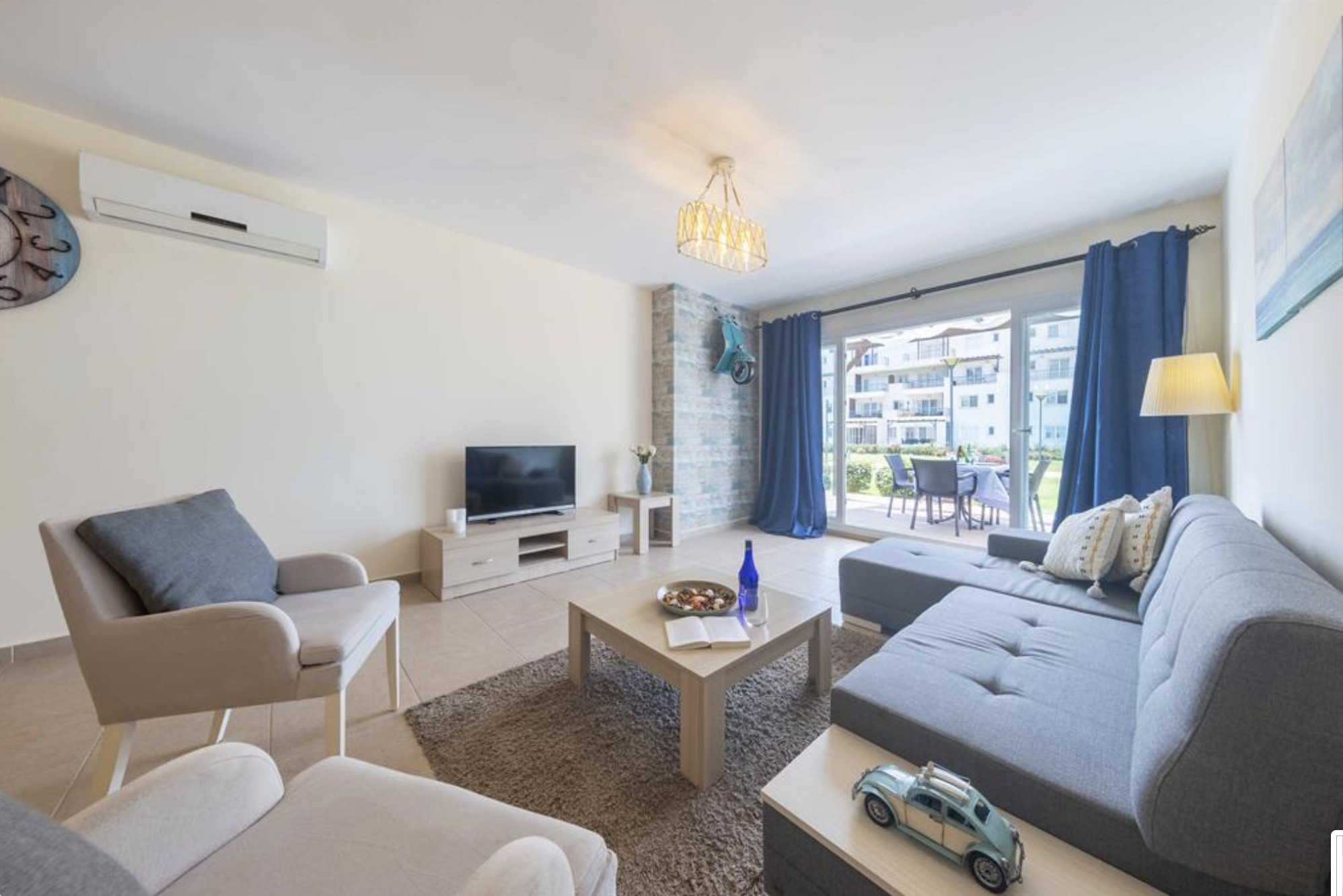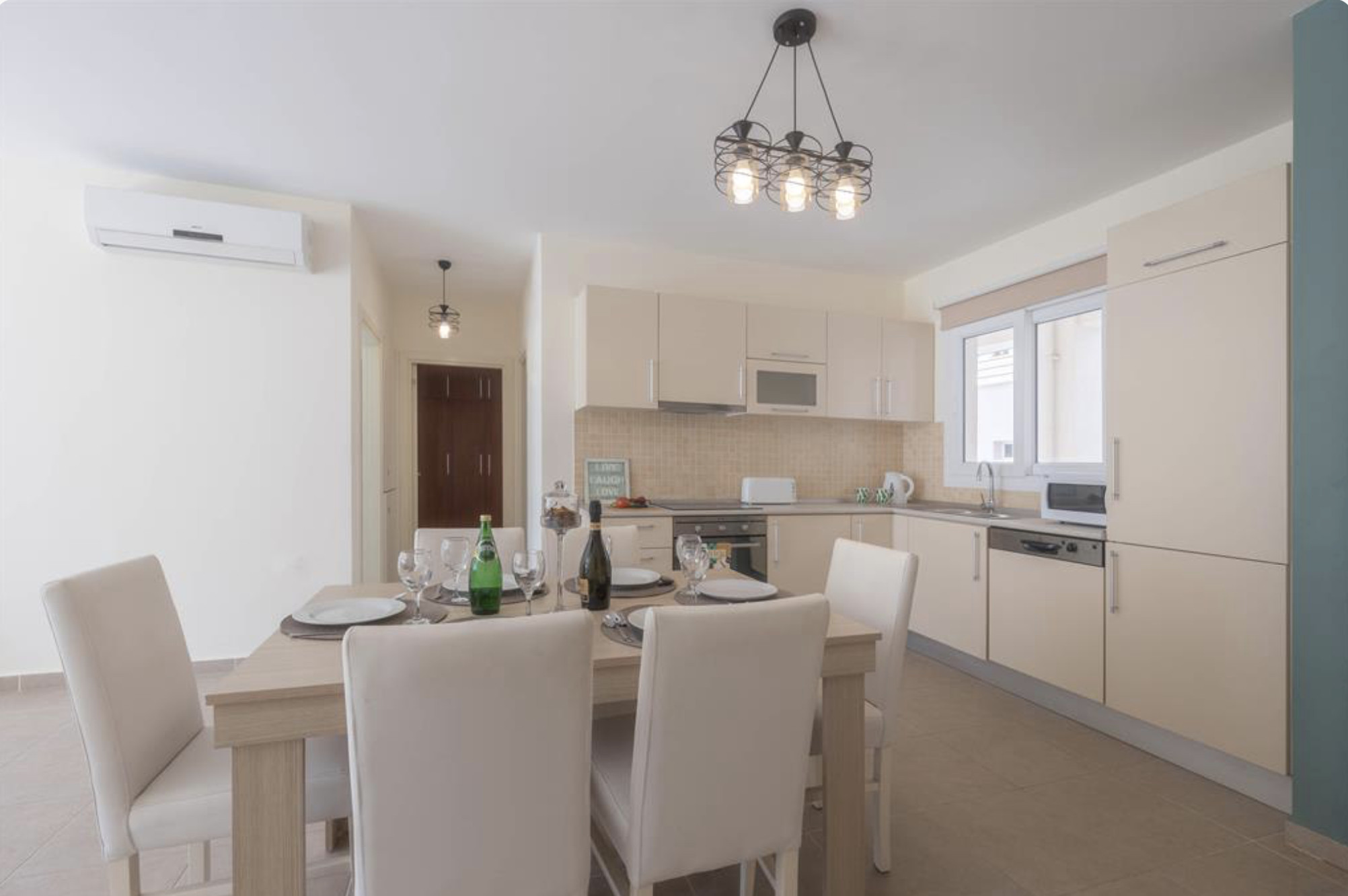 A Spacious 90m2 Three Bedroom Apartment featuring a private pool for guests who are looking for this extra, pampering privacy. This tastefully furnished apartment has a large living room and 3 seperate bedrooms. The apartment has a queen size bed in the master bedroom, 2 single beds in the other, 2nd bedroom and a single bed in the 3rd bedroom. The Apartment is equipped with all essentials such as air conditioning, washing machine, iron, TV and more. Fully equipped kitchen supplied with gas/electric hob, oven, refrigerator & freezer, toaster, kettle dishes/cutlery, and kitchen utensils.