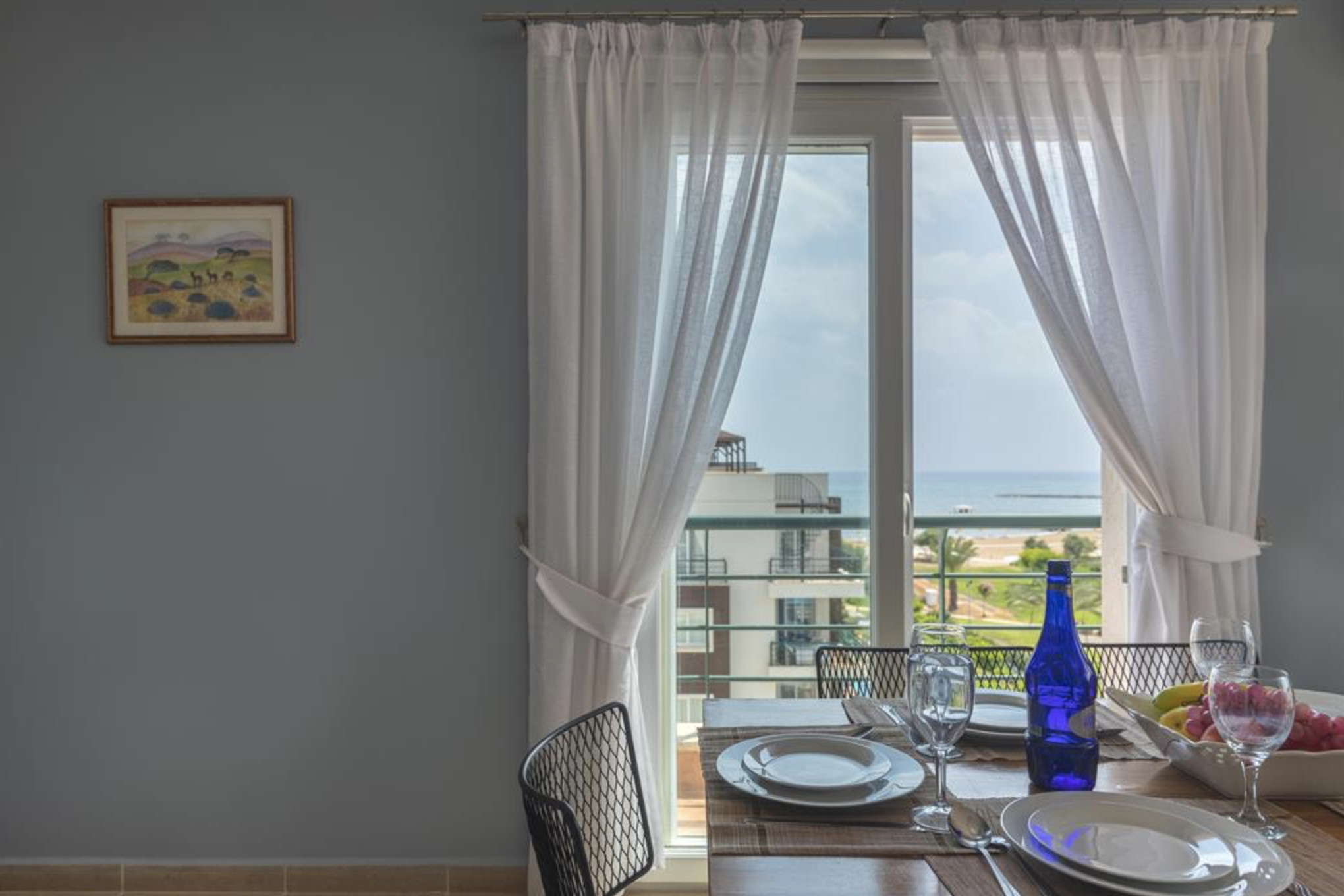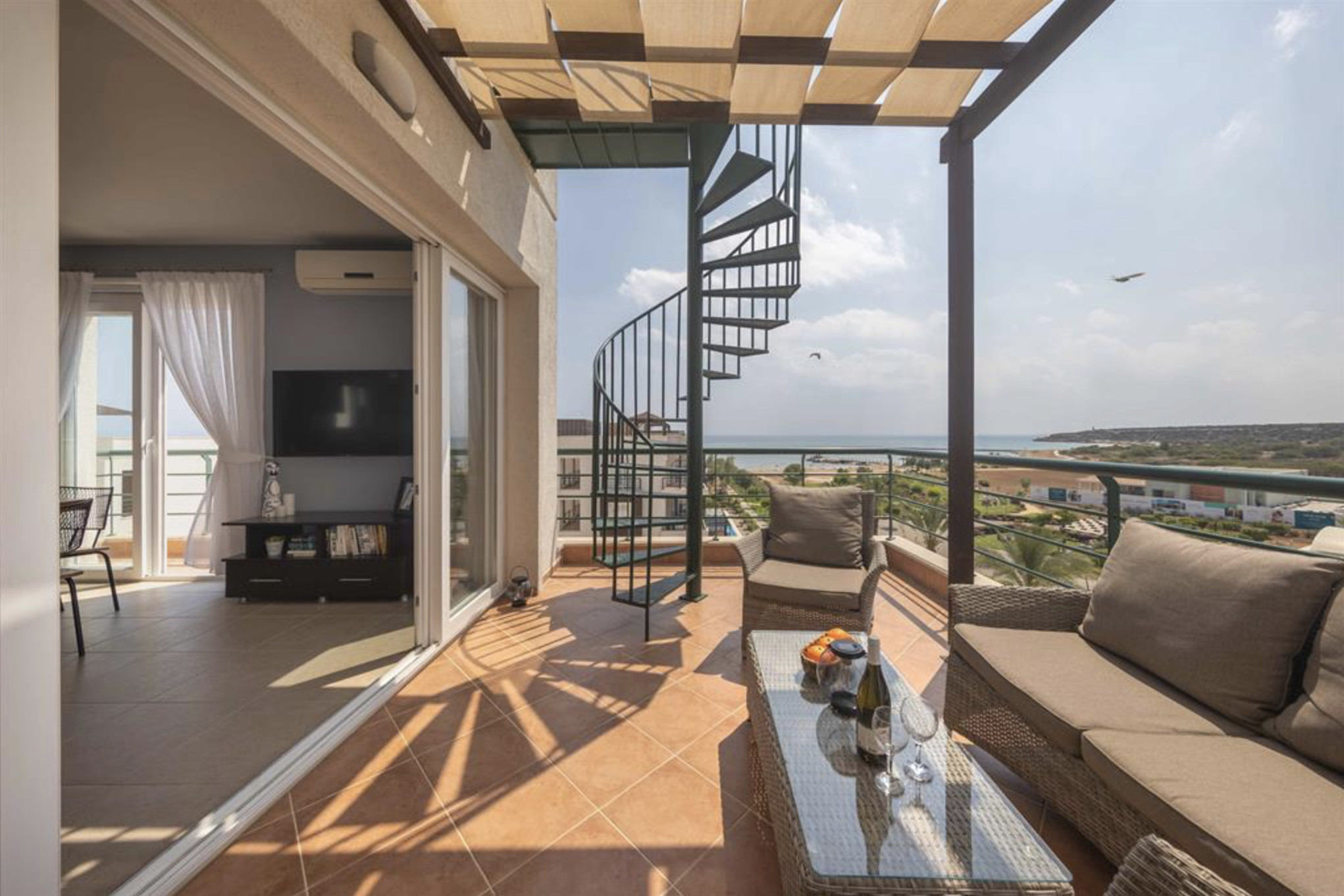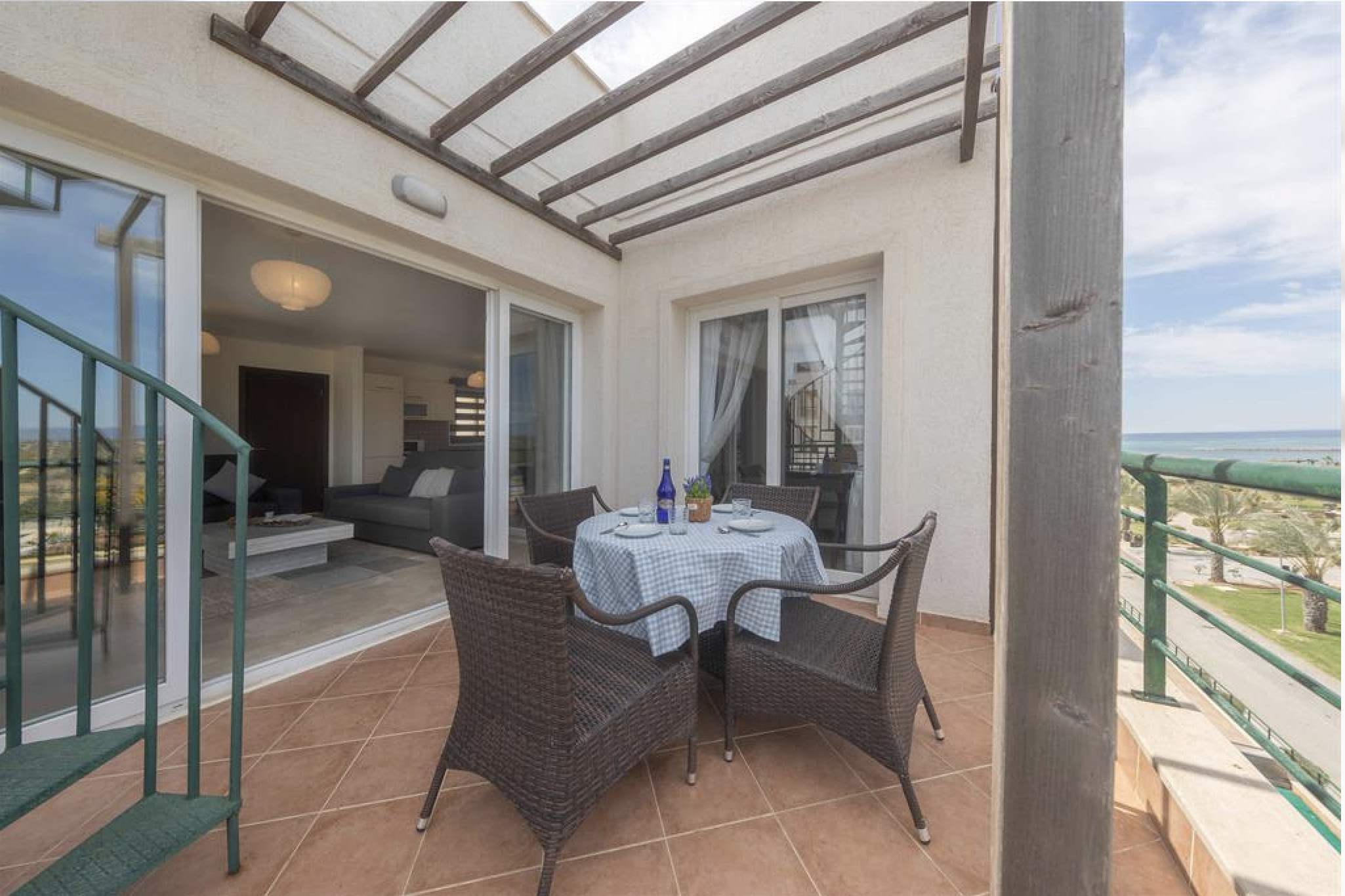 Your living space extends to the 10m2 balcony, furnished with garden furniture, where you can relax and watch the beautiful Mediterranean sea view at both sunrise and sunset. The apartment is located at Thalassa Beach Resort & Spa, in Bafra, on the south east coast of North Cyprus. Thalassa is a residential beachfront resort, perfect for couples, solo travellers as well as families. It is a fantastic resort for long holidays, mini-breaks and weekend getaway holidays in North Cyprus.