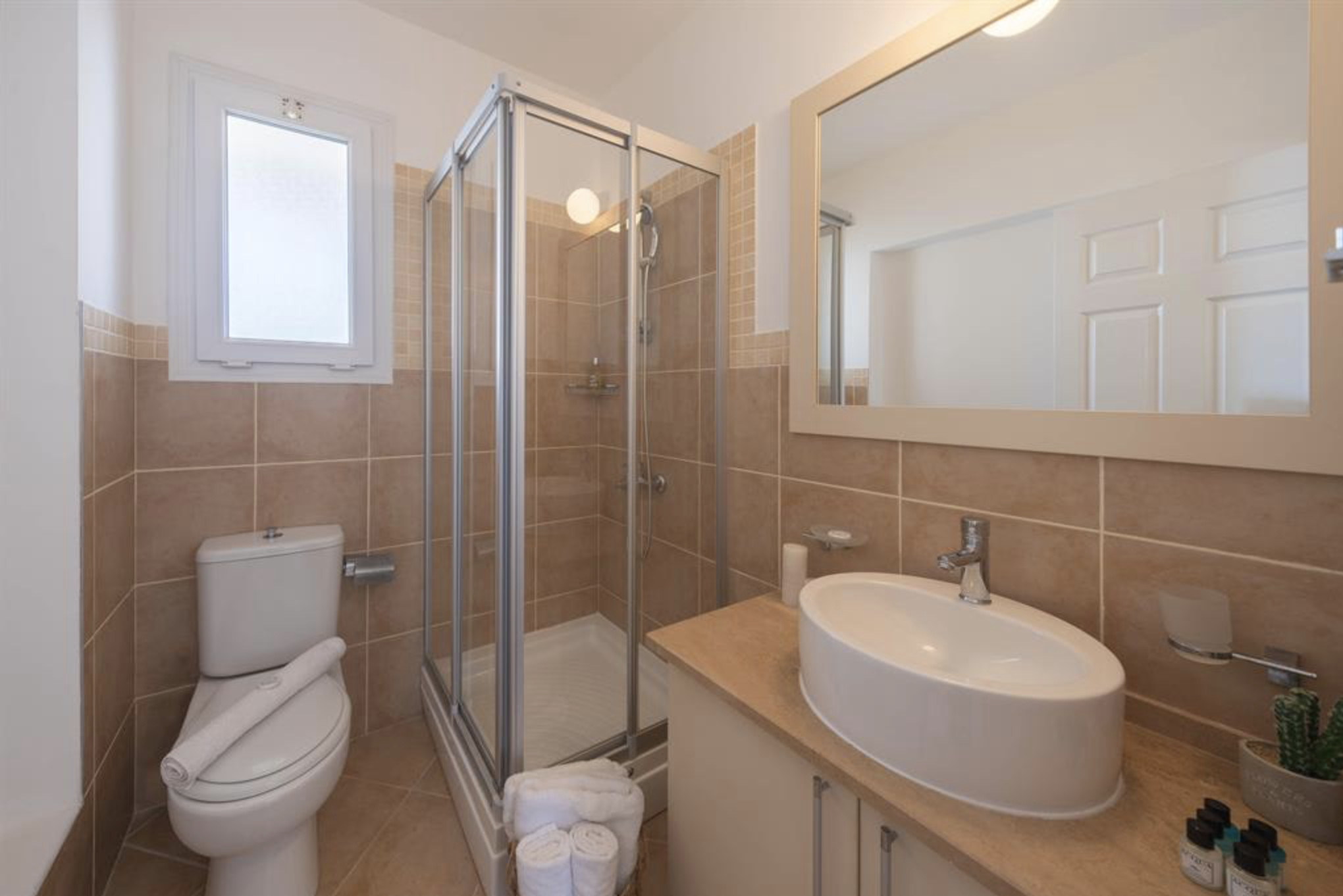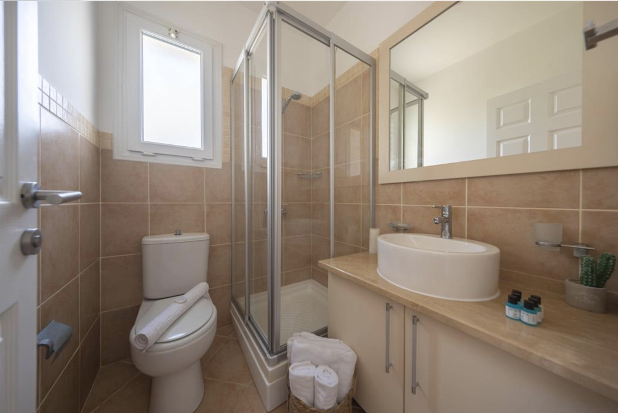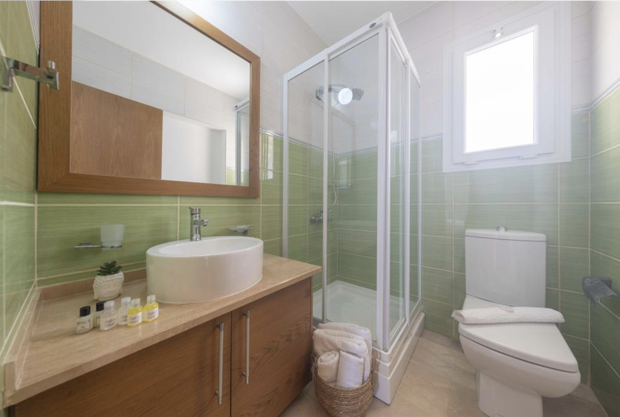 A spacious, 80m2 Three bedroom apartment offering space and comfort for families or group of friends. The apartment has a queen size bed in the master bedroom, 2 single beds in the other, 2nd bedroom and a single bed in the 3rd bedroom. The Apartment is equipped with all essentials such as air conditioning, washing machine, iron, TV and more. Fully equipped kitchen supplied with gas/electric hob, oven, refrigerator & freezer, toaster, kettle dishes/cutlery, and kitchen utensils.