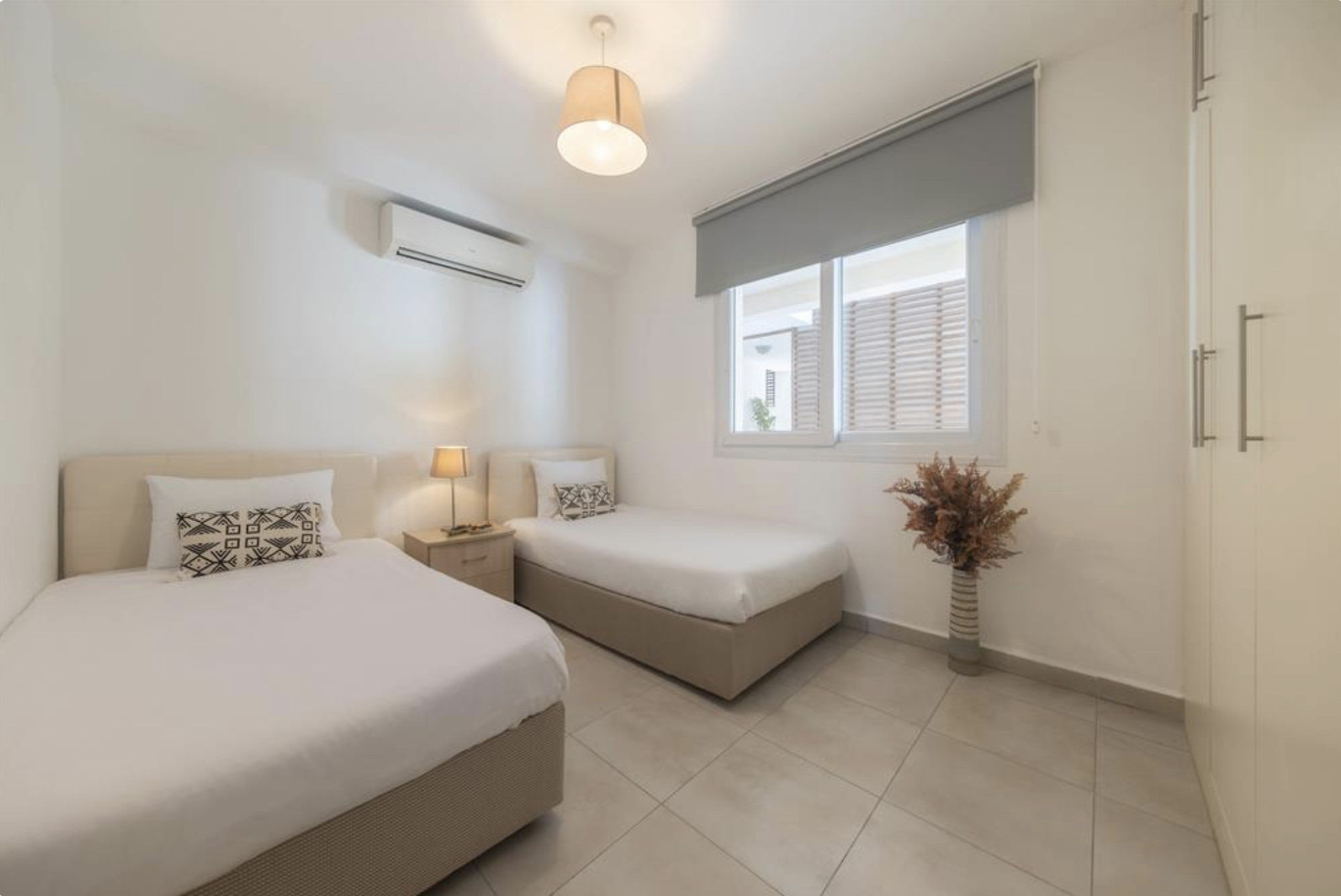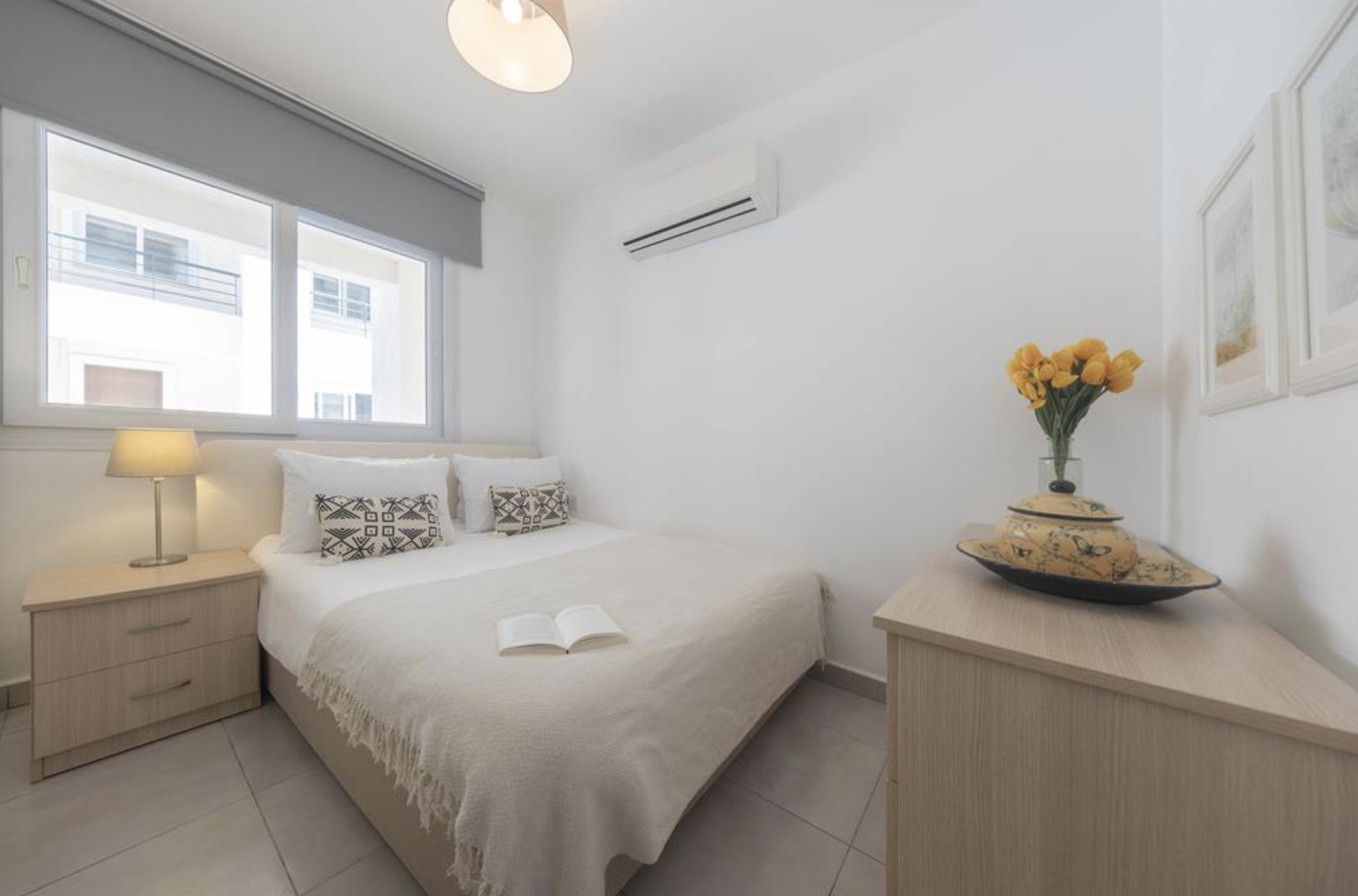 A Spacious 60m2 Two Bedroom apartment with a living room and 2 seperate bedrooms. One bedroom's window is facing the living area while the other bedroom has an external window overlooking outside. The Apartment is tastefully designed in a modern decor and it is fully furnished with all essentials such as air conditioning, washing machine, iron, TV and more. Fully equipped kitchen supplied with gas/electric hob, oven, refrigerator & freezer, toaster, kettle dishes/cutlery, and kitchen utensils.
