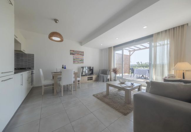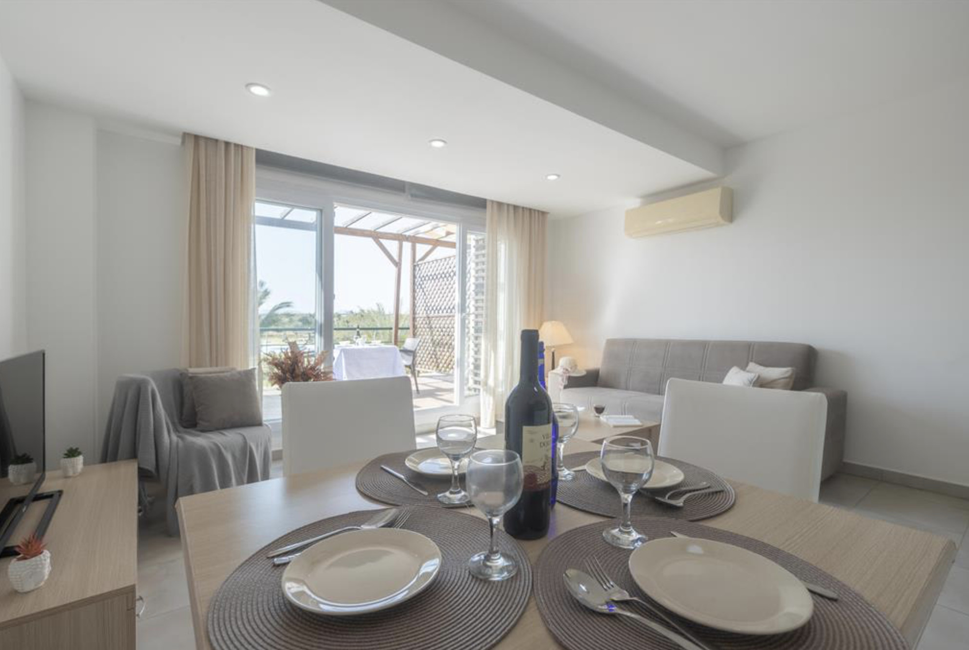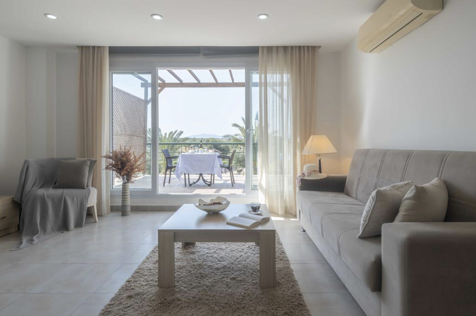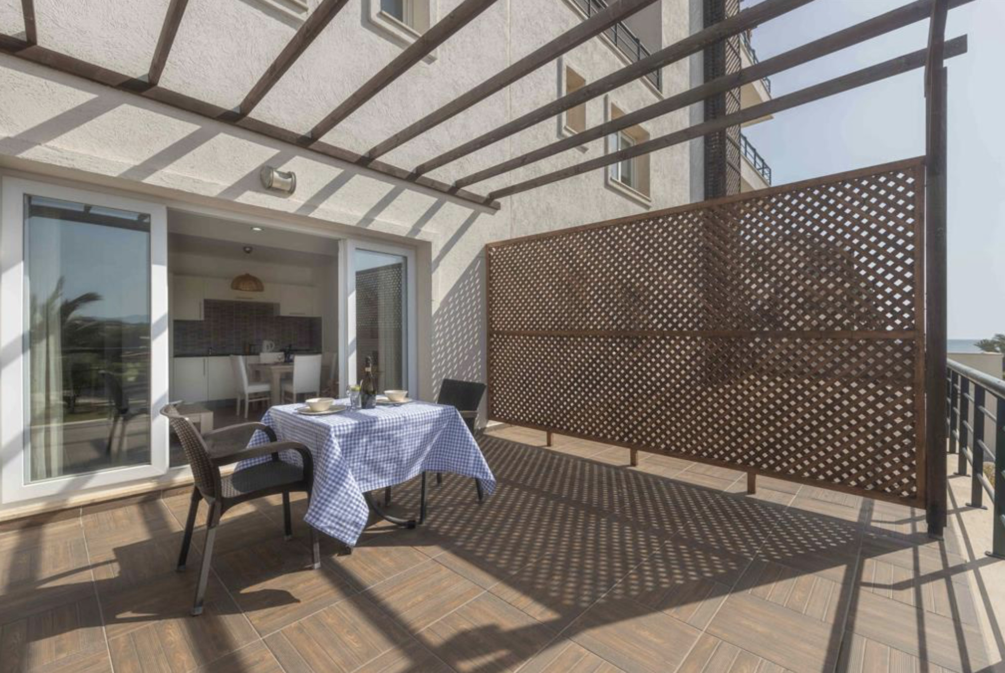 Your living space extends to the 10m2 balcony, furnished with garden furniture, where you can relax and watch the beautiful Mediterranean sea view at both sunrise and sunset. The apartment is located at Thalassa Beach Resort & Spa, in Bafra, on the south east coast of North Cyprus. Thalassa is a residential beachfront resort, perfect for couples, solo travellers as well as families. It is a fantastic resort for long holidays, mini-breaks and weekend getaway holidays in North Cyprus.